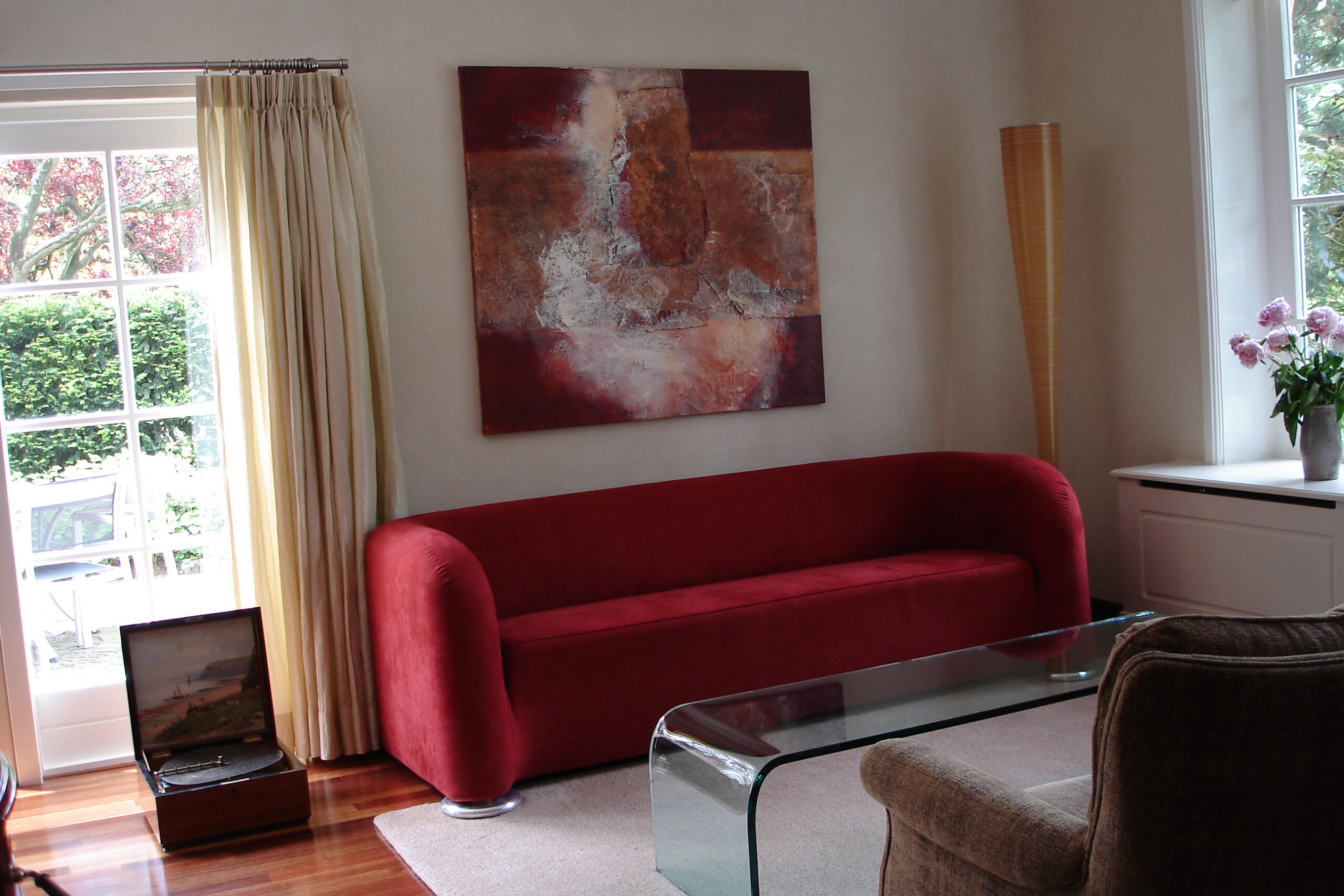 De opdrachtgevers wilden in hun woonkamer een klassieke Engelse bibliotheeksfeer en tegelijkertijd strakke moderne elementen. In het nieuwe interieur moest plaats worden ingeruimd voor een aanwezige antieke kast in rood en groen tinten.